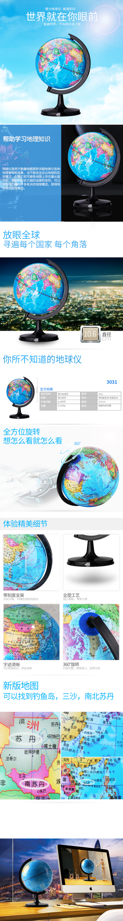 得力(deli) 3031 直径10.6cm 地球仪高清标准教学 蓝色(单位:个)