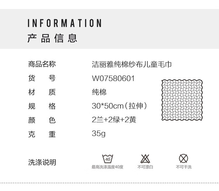 洁丽雅(Grace) 童巾6条装 7333 30*50cm*35g 混色(单位:组)