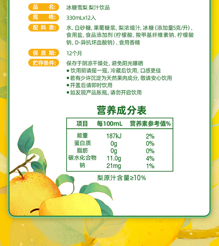 康师傅 冰糖雪梨 茶饮料、果汁饮料 330ml*12 夏季畅饮 黄色(单位:箱)