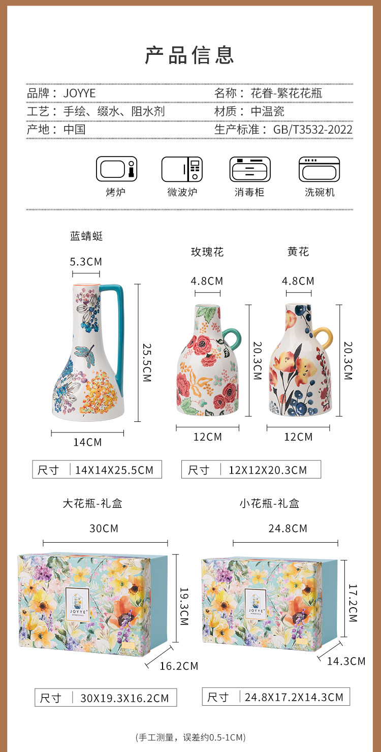 JOYYE 花眷-繁花大花瓶 14x14x25.5cm,瓶口5.3cm 釉下彩手绘花瓶 蓝色(单位:个)