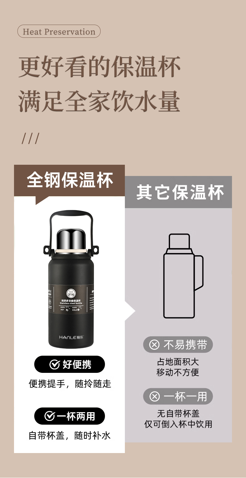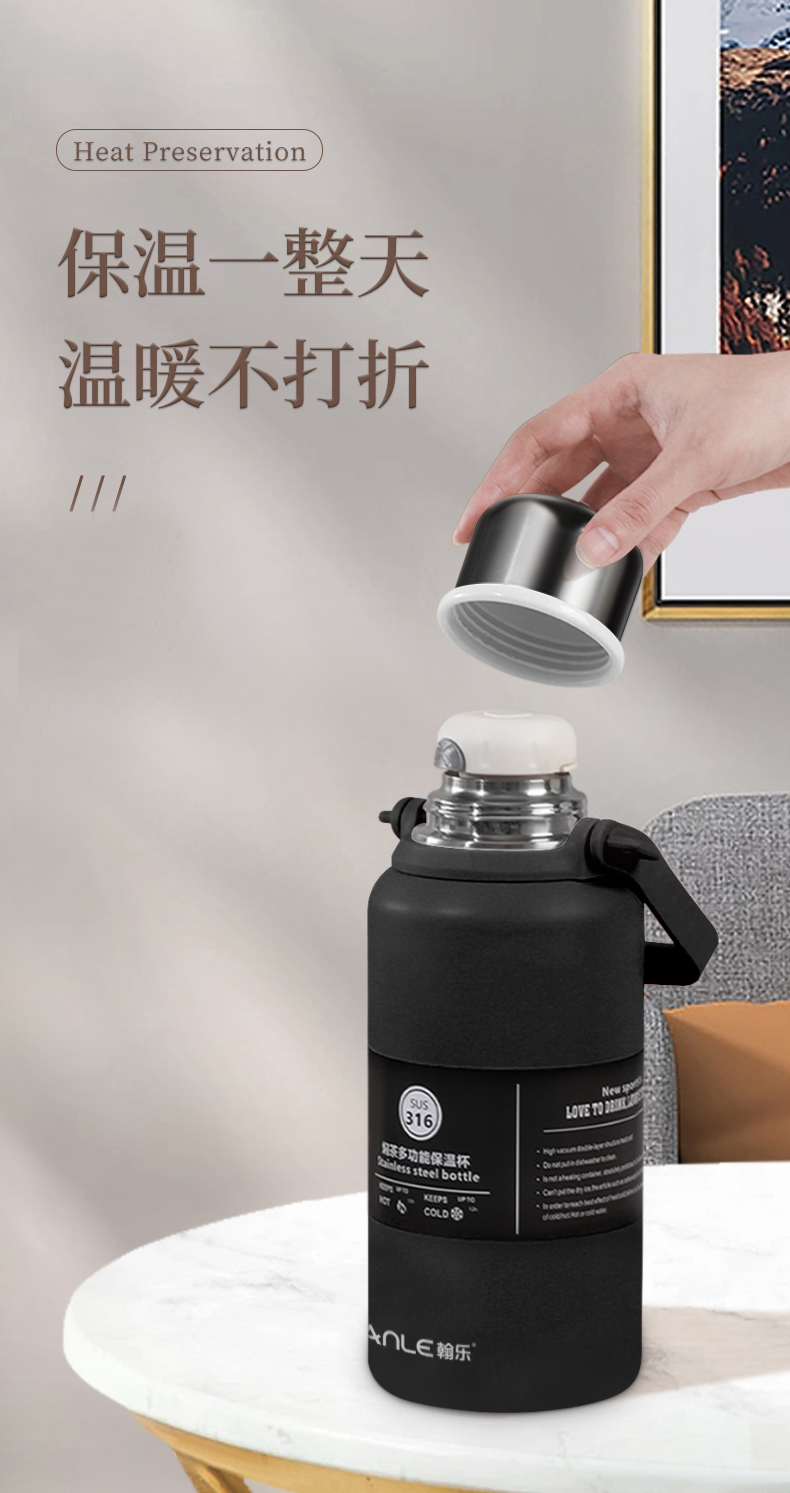 翰乐 大容量316不锈钢户外旅行保温杯 HL-M06 1200ml 黑色(单位:个)