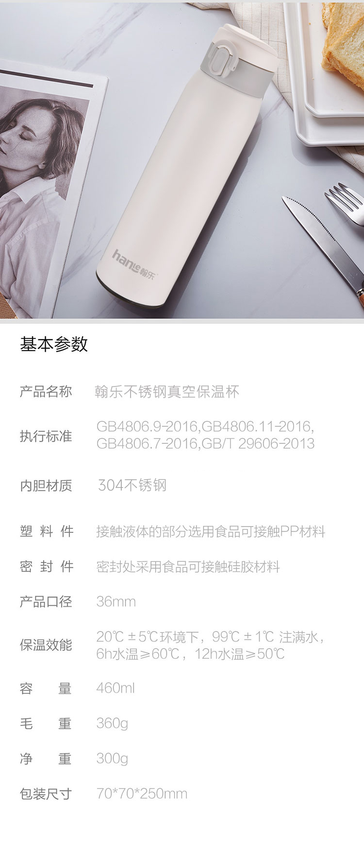 翰乐 保温杯 HL-M01 460ml 乳白色(单位:个)
