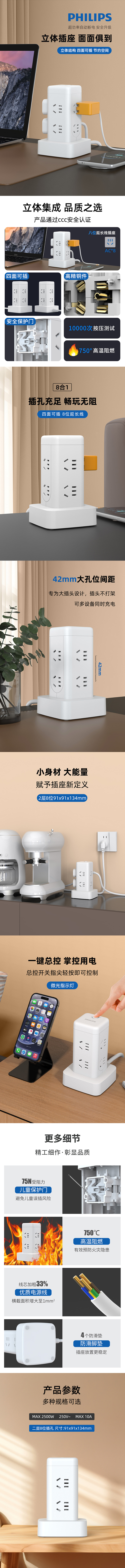 飞利浦(PHILIPS) 新国标立式八位总控USB口儿童保护门插排 SPN4082W/93-1.7米 2500W 白色(单位:个)