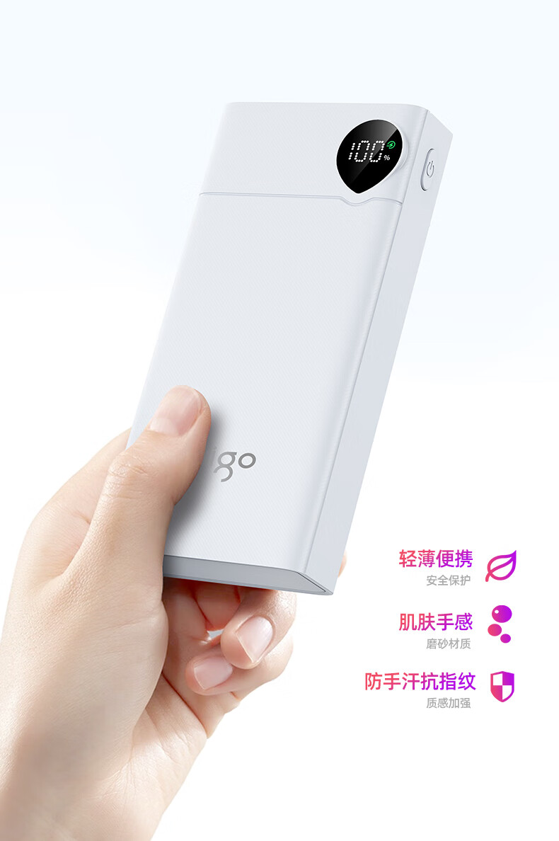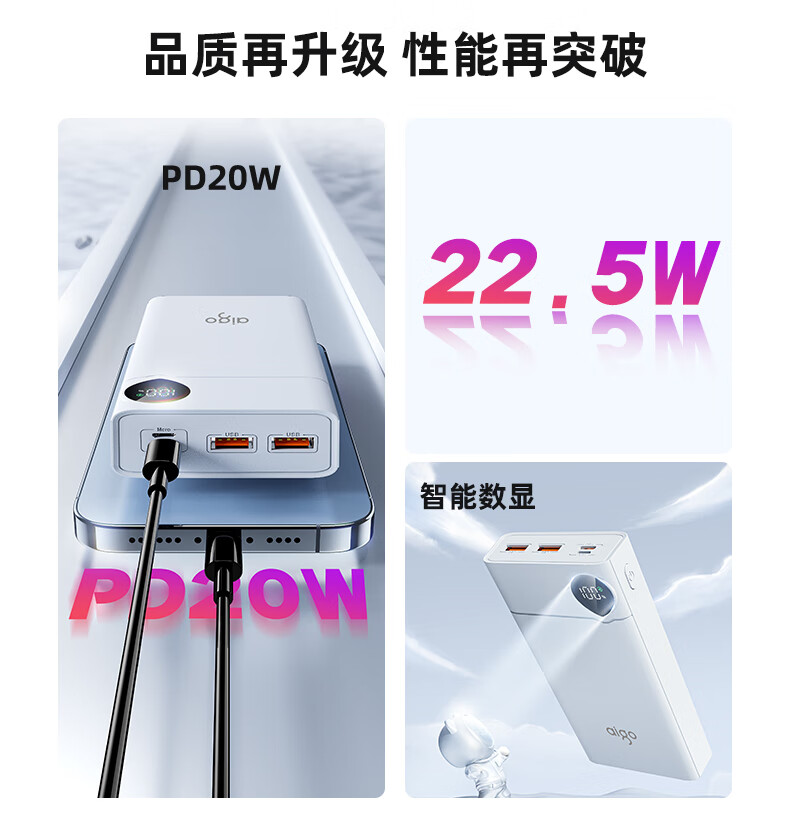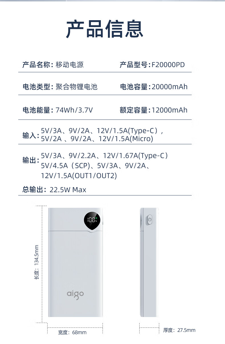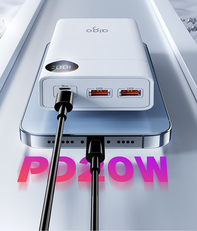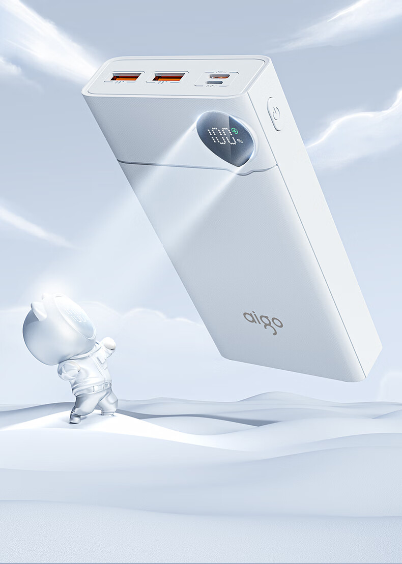 爱国者F20000PD充电宝20000毫安大容量Type-C快充22.5W迷你随身移动电源可上飞机 白色