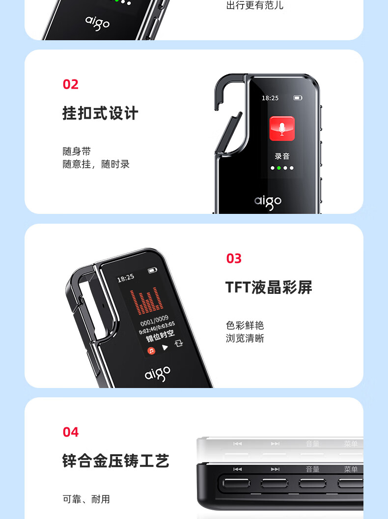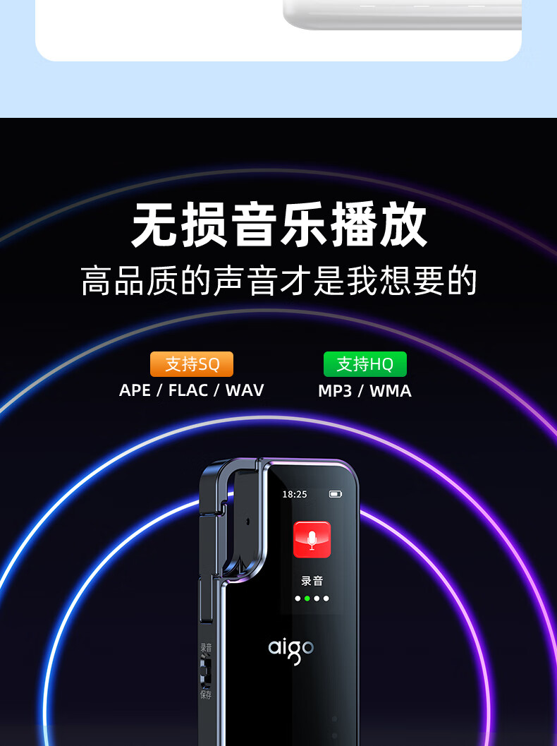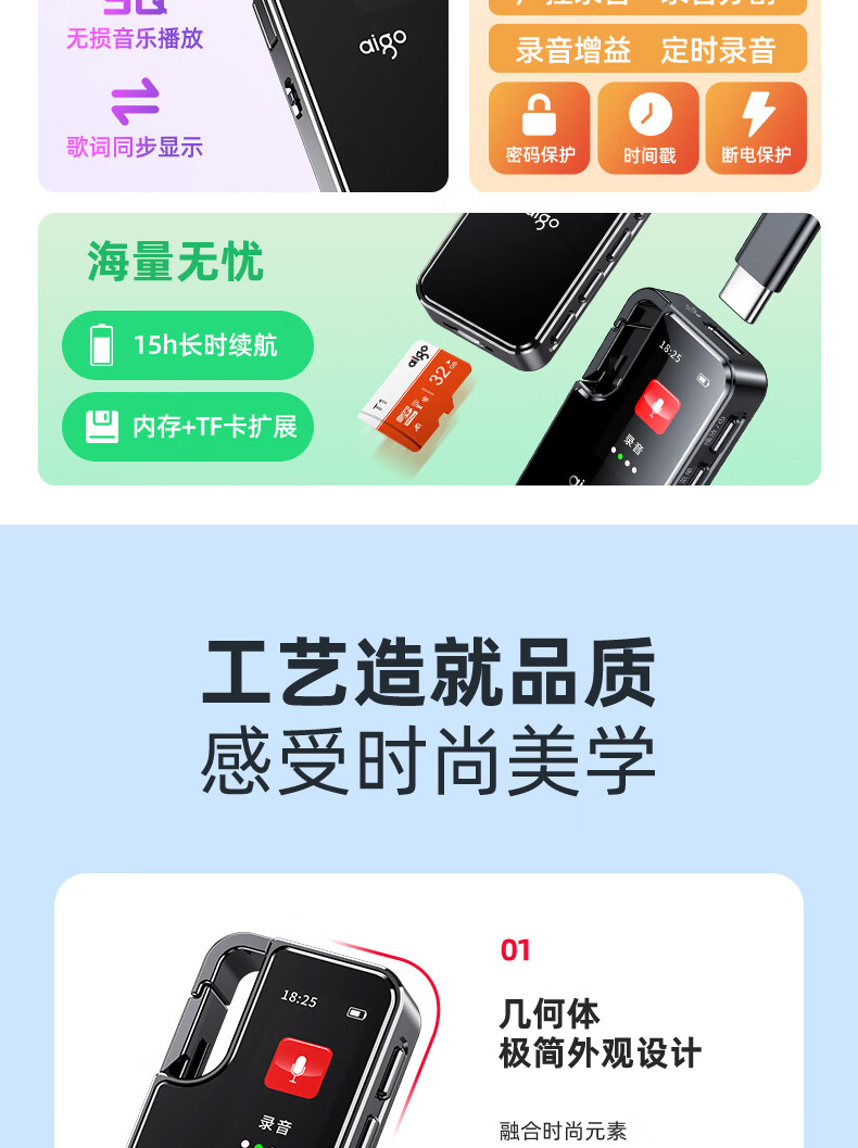 爱国者aigo MP3-206 音乐播放器一键录音笔TF卡扩容智能专业录音16G 黑色