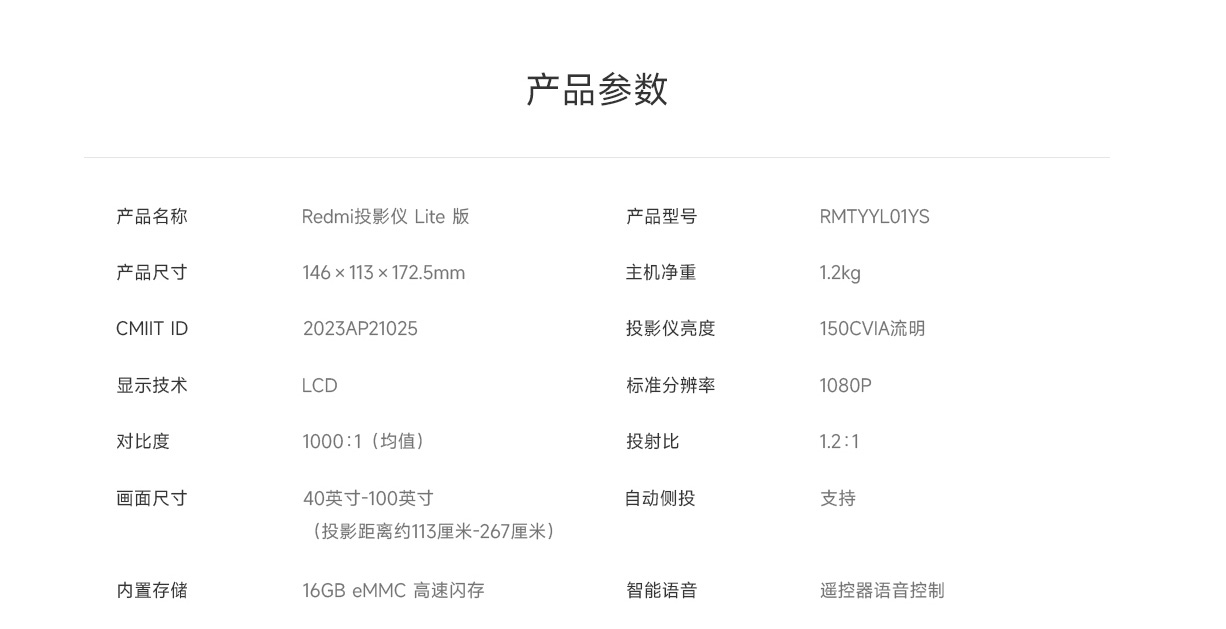 小米Redmi投影仪 Lite 版(单位:台) 白色