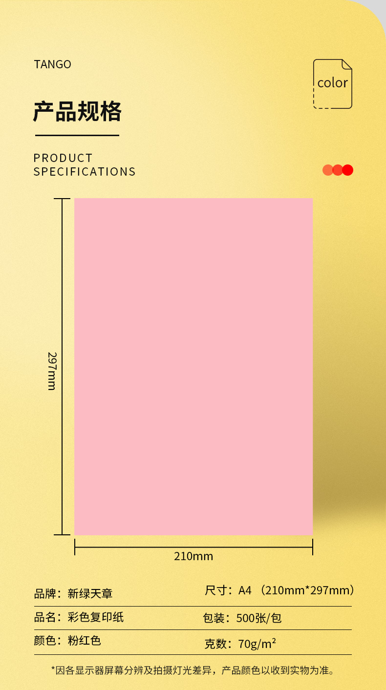 天章 (TANGO)新绿天章A4 粉红色 彩色复印纸 打印凭证纸 浅粉色彩纸70g 500张/包 包 粉色