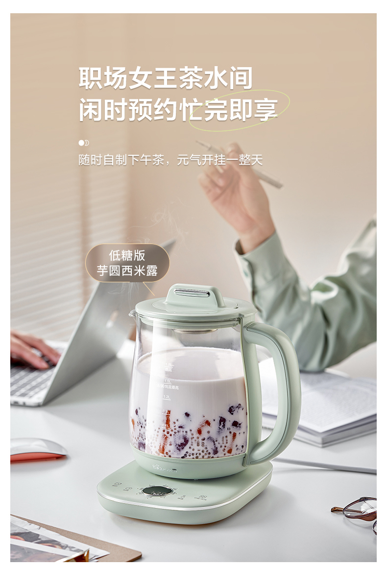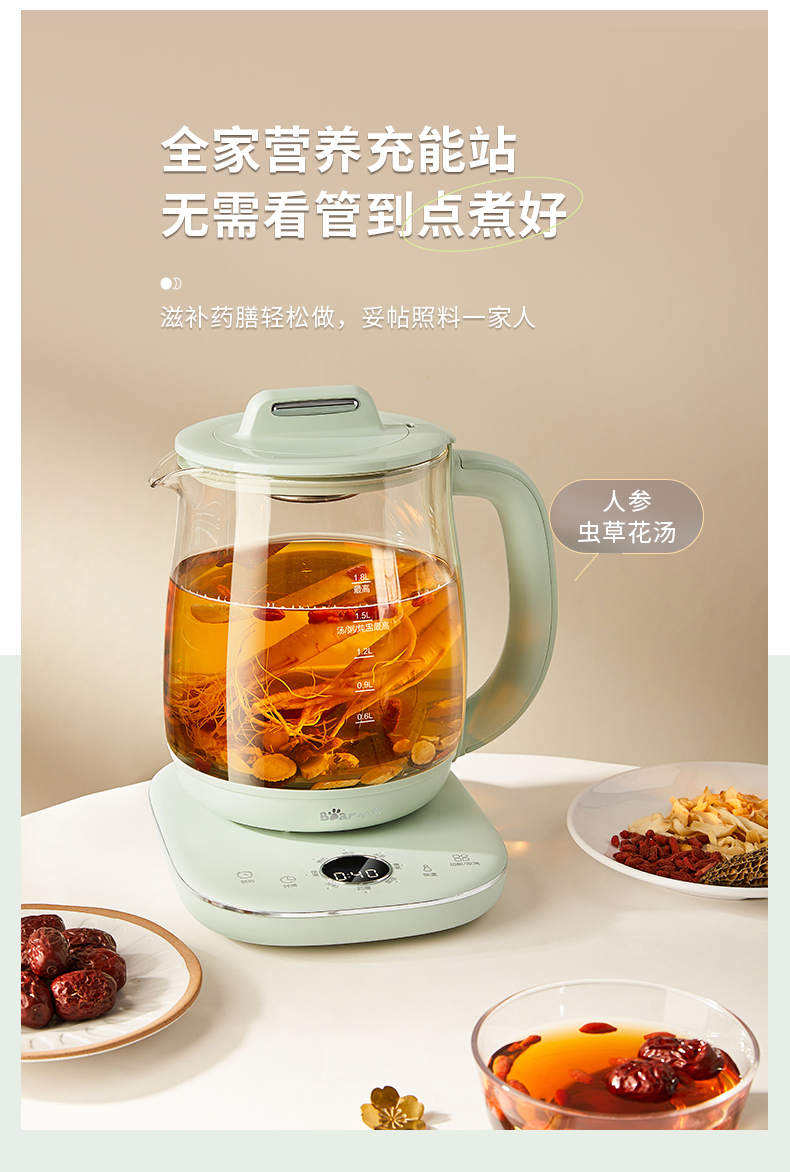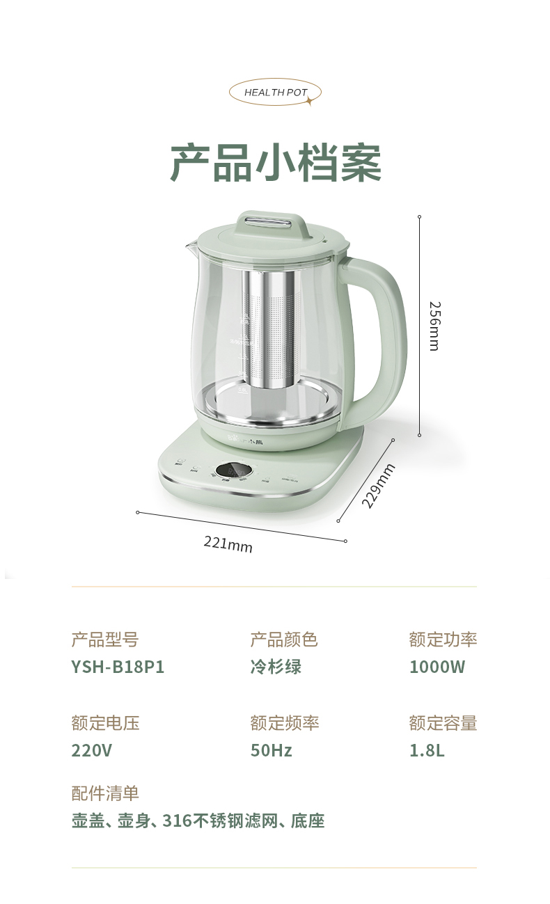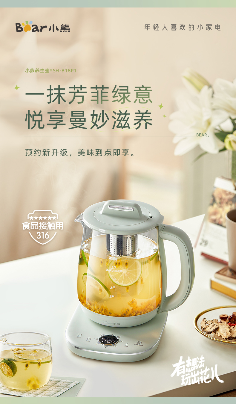 小熊 养生壶 1.8L 可拆卸滤网 长时预约 8大菜单 YSH-B18P1(台) 浅绿色