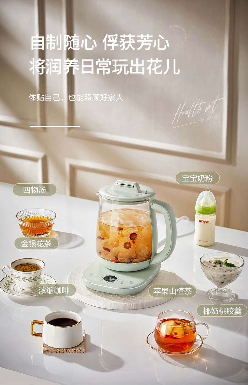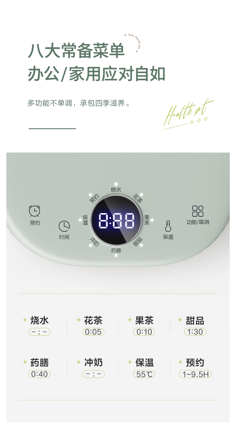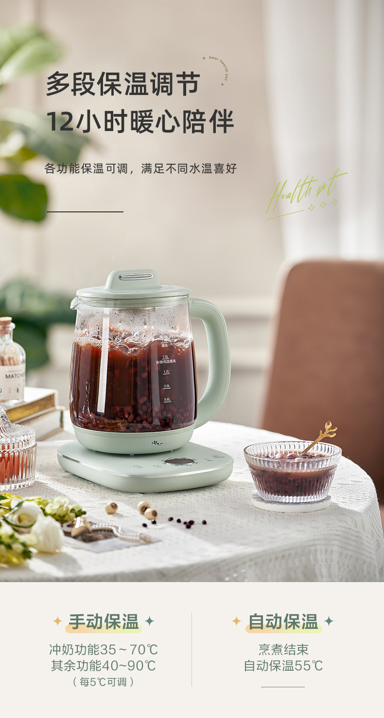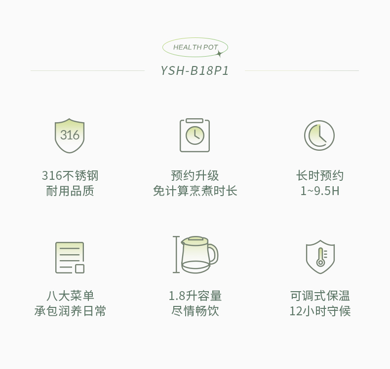 小熊 养生壶 1.8L 可拆卸滤网 长时预约 8大菜单 YSH-B18P1(台) 浅绿色
