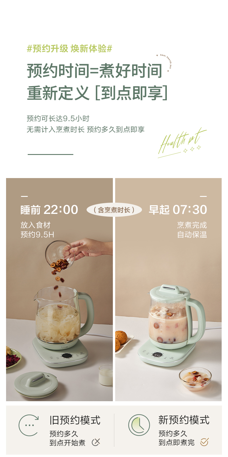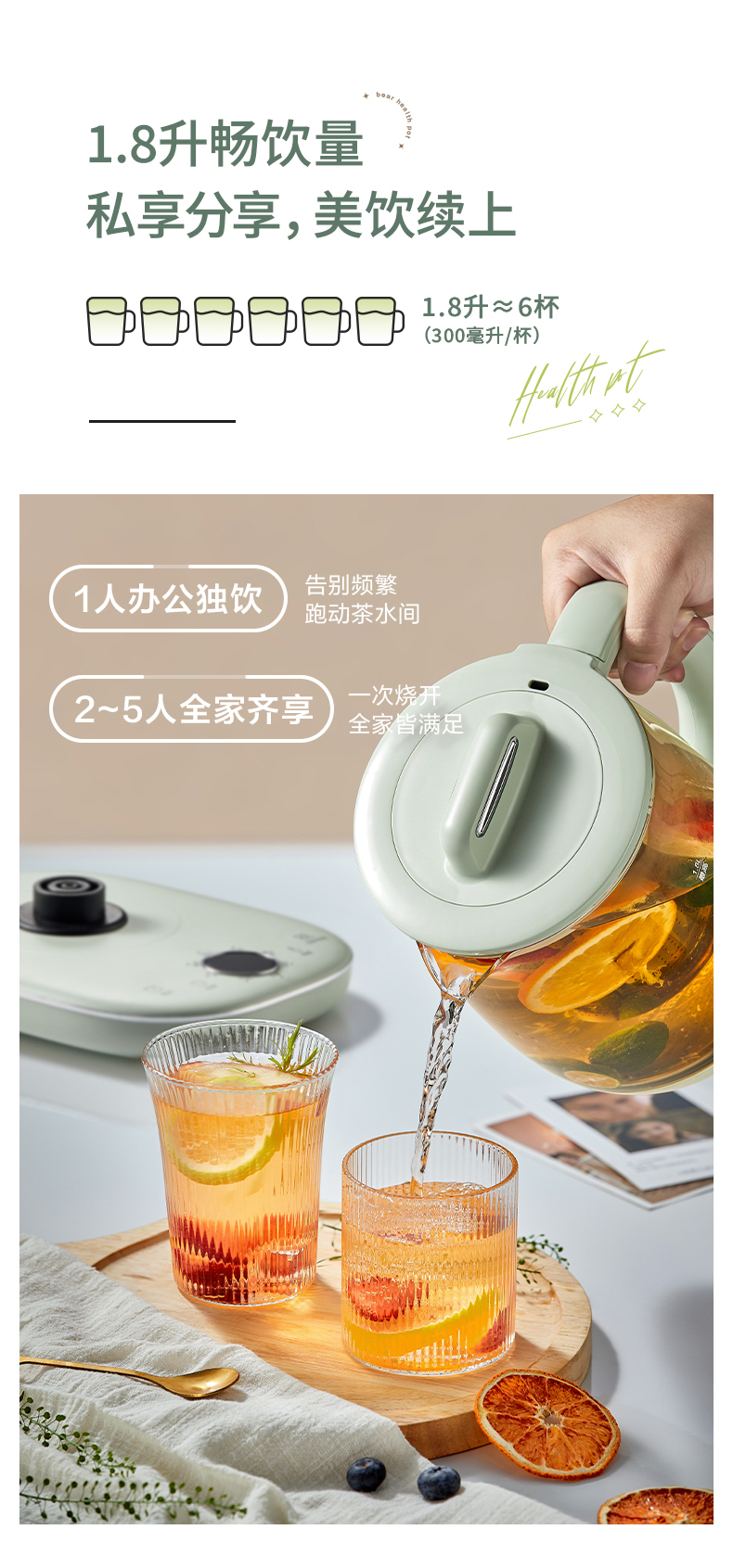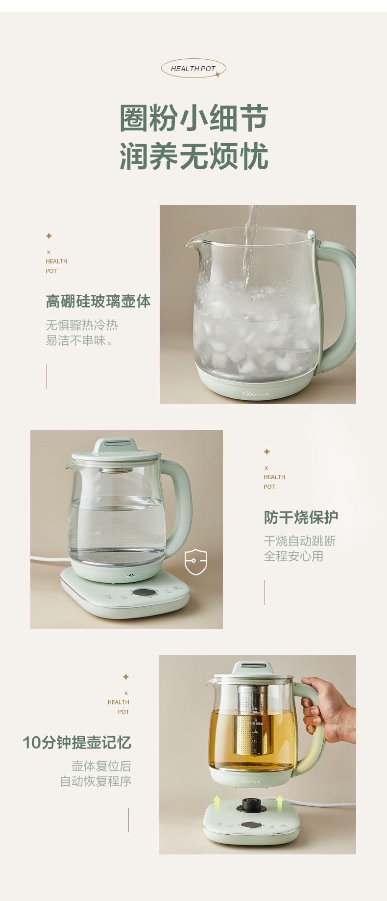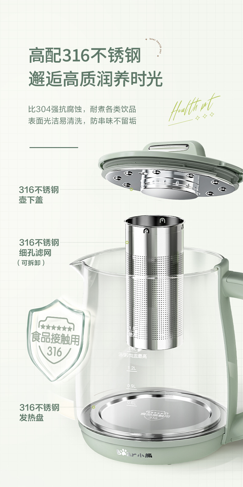 小熊 养生壶 1.8L 可拆卸滤网 长时预约 8大菜单 YSH-B18P1(台) 浅绿色