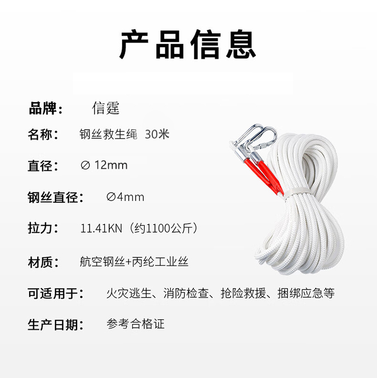 信霆 高空作业安全绳钢丝芯逃生绳丙纶救援绳 12mm*30米 带双大扣/包 白色