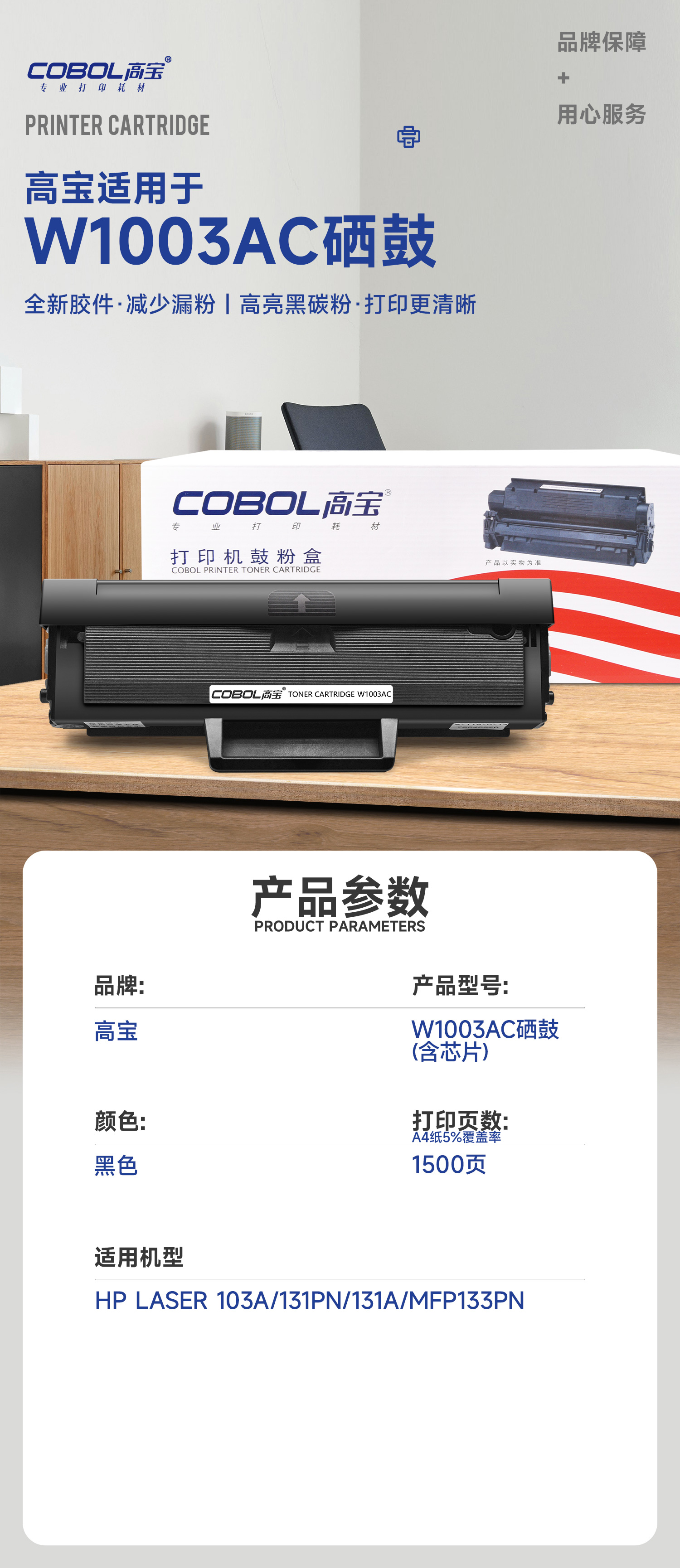 高宝COBOL W1003AC硒鼓含芯片适用适用于惠普 103a, 131a, 133pn) W/支 曜石黑