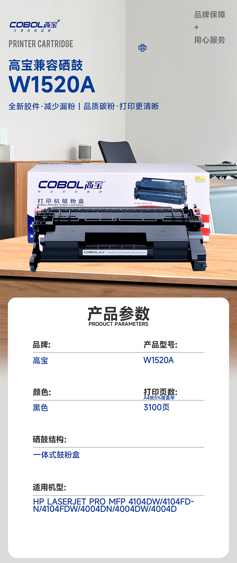 高宝(COBOL)W1520A硒鼓适用惠普4104fdw/fdn 4004dn/dw打印机含芯片/支 曜石黑