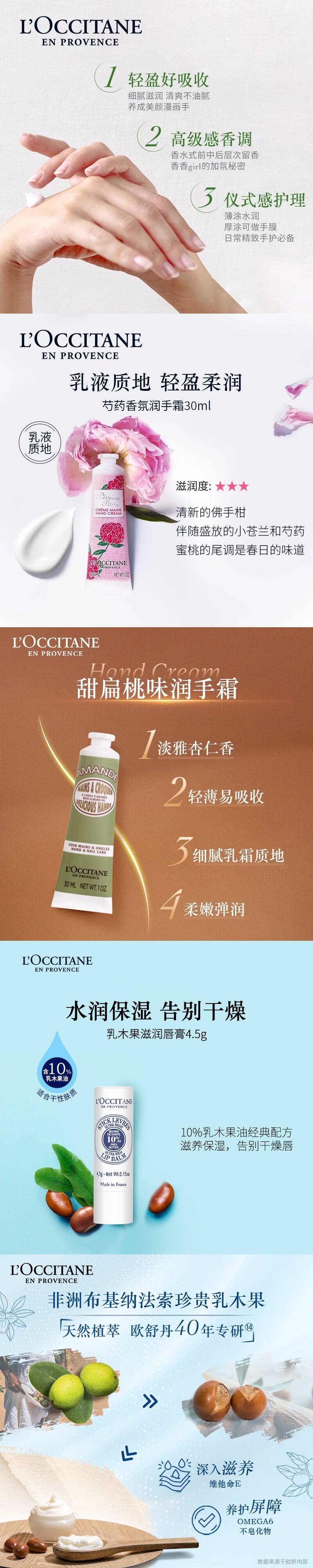 欧舒丹(L'OCCITANE) 甜扁桃芍药 护手霜30ml*2+唇膏4.5g 手唇礼盒3件套 香槟黄(单位:套)