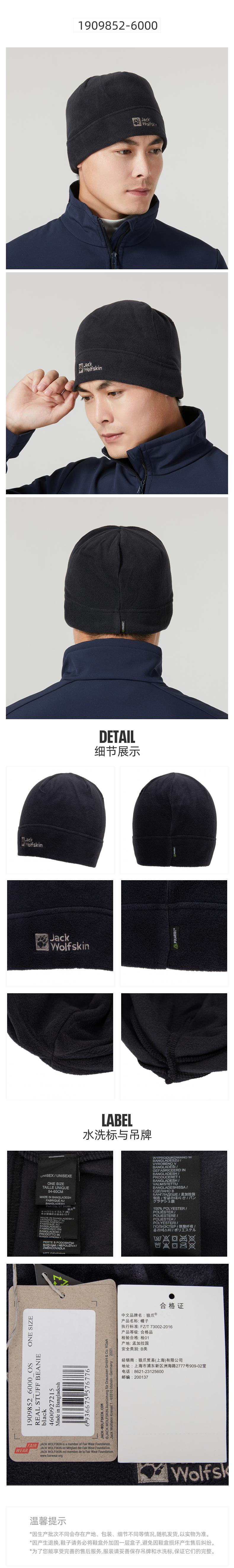 狼爪 1909852-6000 100%聚酯纤维 中性抓绒帽 黑色(单位:个)