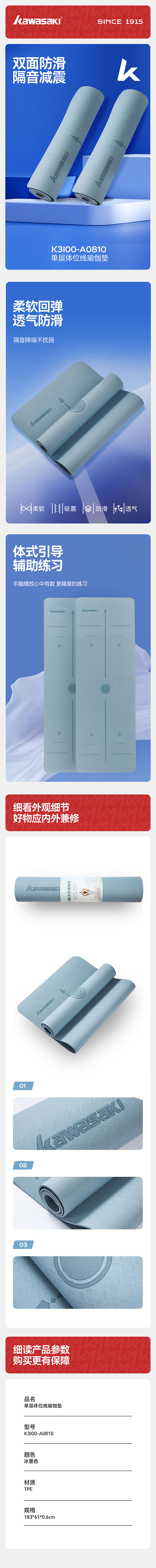 川崎(KAWASAKI) K3I00-A0810-2 尺寸:183*61*0.6cm 瑜伽垫 冰墨色(单位:张)