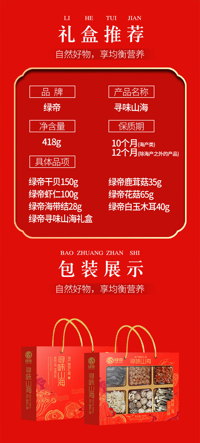 绿帝(GREEN KING) 寻味山海海产菌菇干货礼盒 418g 菌菇礼盒 红色(单位:盒)