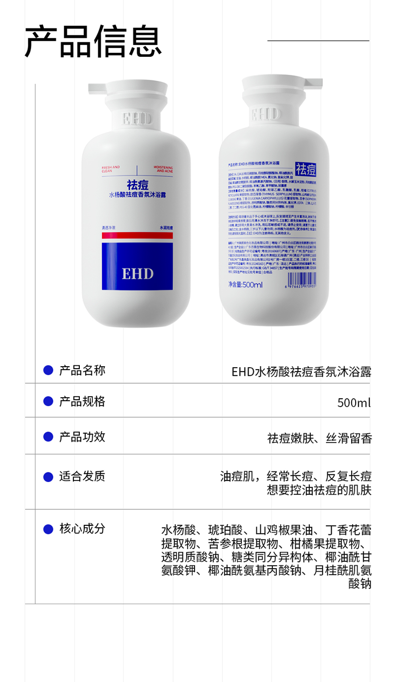 EHD 沐浴露 水杨酸净痘香氛 500ml 白色(单位:瓶)