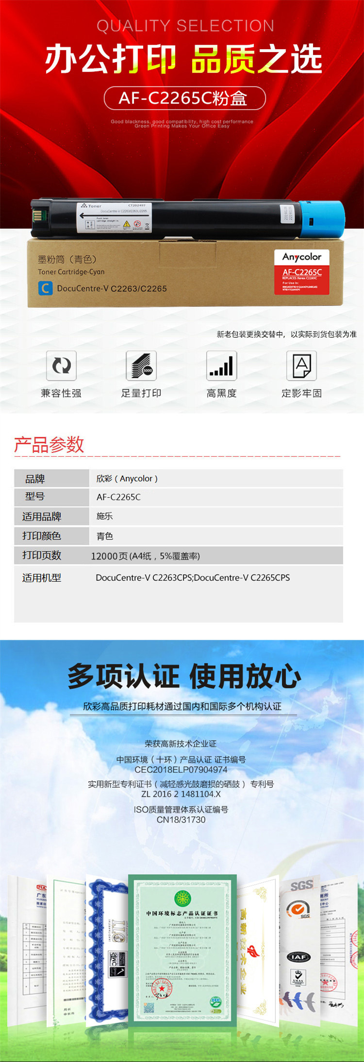 欣彩AF-C2265C青色粉盒 五代墨粉盒12K 适用富士施乐CT202497 DC-V C2263 C2265 AP C2060 C2560 C3060复印机 蓝色