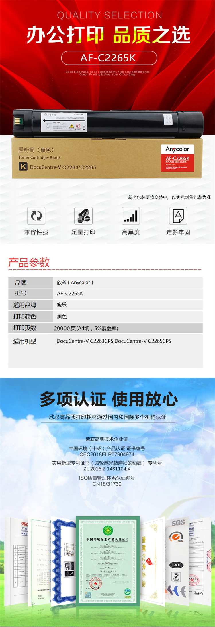 欣彩AF-C2265K黑色粉盒 五代墨粉盒20K 适用富士施乐CT202496 DC-V C2263 C2265 AP C2060 C2560 C3060复印机 黑色