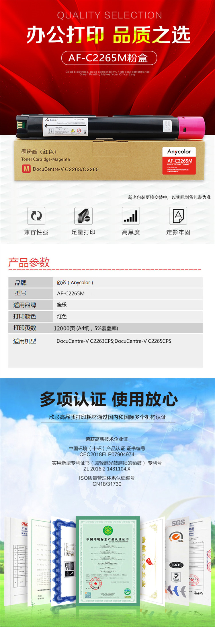 欣彩AF-C2265M红色粉盒 五代墨粉盒12K 适用富士施乐CT202498 DC-V C2263 C2265 AP C2060 C2560 C3060复印机 红色
