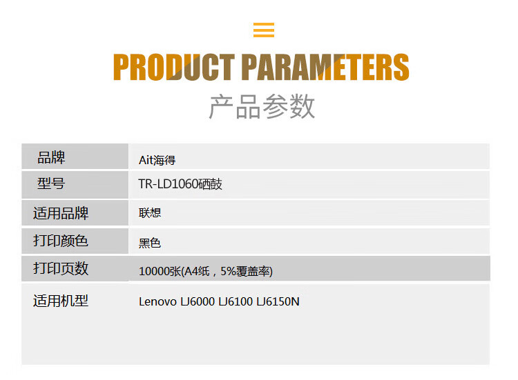 海得(ait) TR-LD1060 专业版 用联想LENOVO LJ6000 LJ6100 LJ6150N LD1060 打印量:10000页 硒鼓 1.00 只/支 (计价单位:支) 黑色