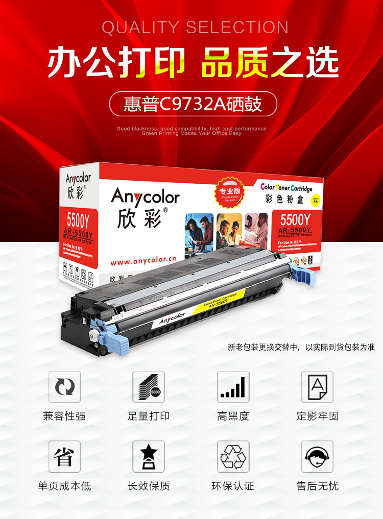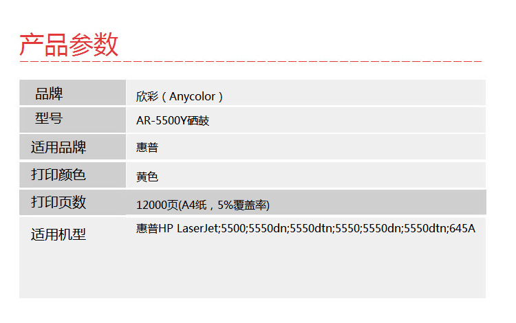 欣彩(Anycolor) AR-5500Y 专业版 12000页 适用惠普5500 硒鼓 1.00 只/支 (计价单位:支) 黄色