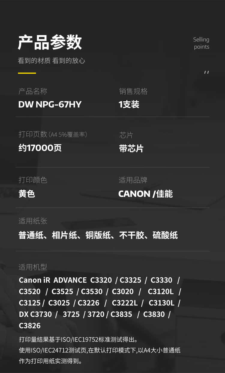 帝威(DW) NPG-67HY (带芯片)(适用佳能C3320/C3325/C3330/C3520/C3525)打印量:17000页 粉盒 1.00 只/支 (计价单位:支) 黄色