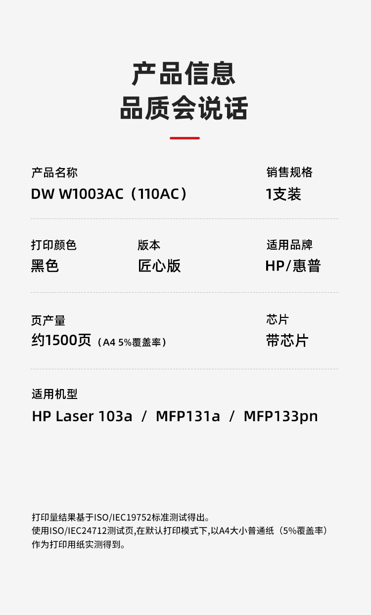 帝威(DW) W1003AC(110AC) (带芯片)匠心版(适用惠普103a/MFP131a/MF133pn)打印量:1500页 硒鼓 1.00 只/支 (计价单位:支) 黑色