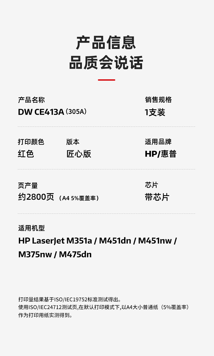 帝威(DW) CE413A(305A) (带芯片)匠心版(适用惠普HPM351a/M451dn/M451nw)打印量:2800页 硒鼓 1.00 只/支 (计价单位:支) 红色