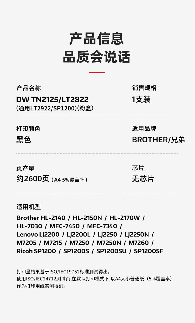 帝威(DW) TN2125/LT2822(通用LT2922/SP1200) (无芯片)匠心版(适用兄弟HL-2140)打印量:2600页 粉盒 1.00 只/支 (计价单位:支) 黑色