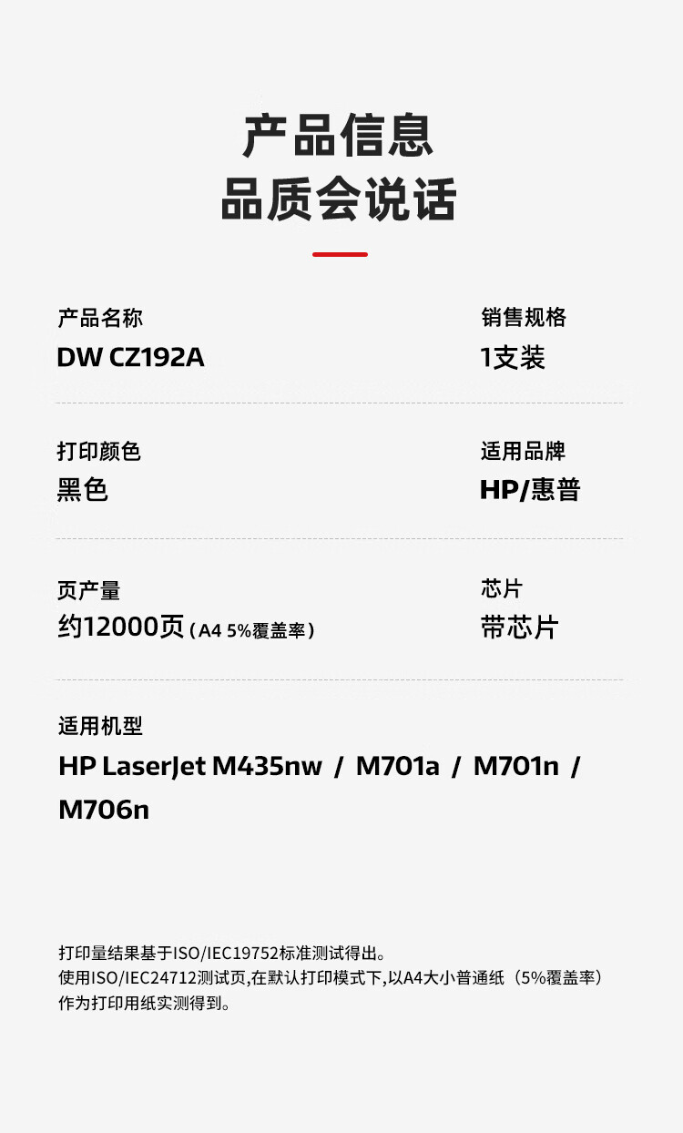 帝威(DW) CZ192A (带芯片)匠心版(适用惠普M435nw/M701a/M701n/M706n)打印量:12000页 硒鼓 1.00 只/支 (计价单位:支) 黑色