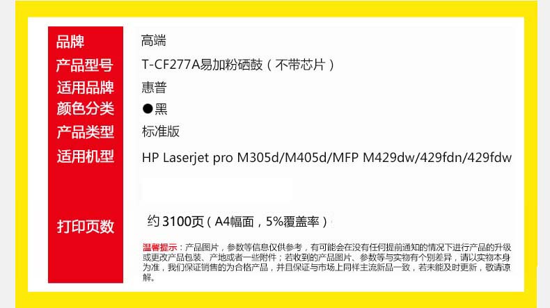 高端 T-CF277A(不带芯片)打印量3100页 适用惠普M305d/M405d/MFP M429dw/429fdn/429fdw 粉盒 1.00 只/个 (计价单位:个) 黑色