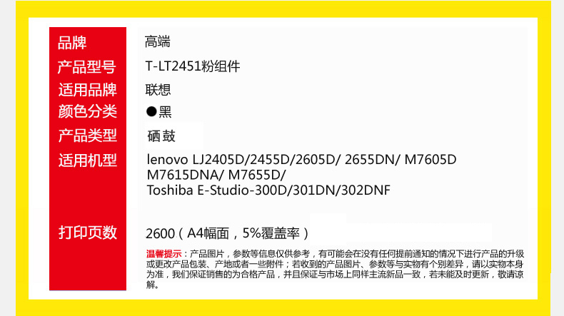 高端 T-LT2451粉组件 打印量2600页 适用联想M7455DNF硒鼓M7675DXF墨盒M7405D 粉盒LJ2655DN 标准版 粉盒 1.00 只/个 (计价单位:个) 黑色