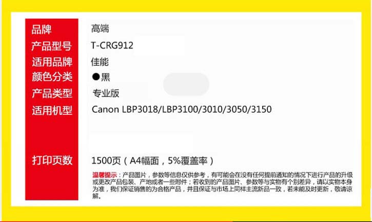 高端 T-CRG912 打印量1500页 适用佳能Canon LBP3018/LBP3100/3010/3050/3150硒鼓 硒鼓 1.00 只/个 (计价单位:个) 黑色