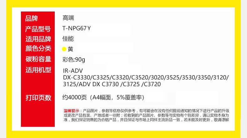 高端 T-NPG67小容量黄色4000页 专业版 适用佳能C3020 C3520 3120 C3720 3320 粉盒 (计价单位:只) 黄色