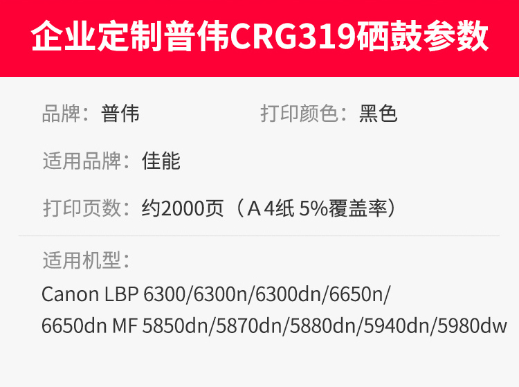 普伟 CRG-319(支)(黑色2000页)适用于LBP6300n、LBP6650n、LBP6300dn、LBP6650dn、LBP6670dn 硒鼓 1.00 只/支 (计价单位:支) 黑色