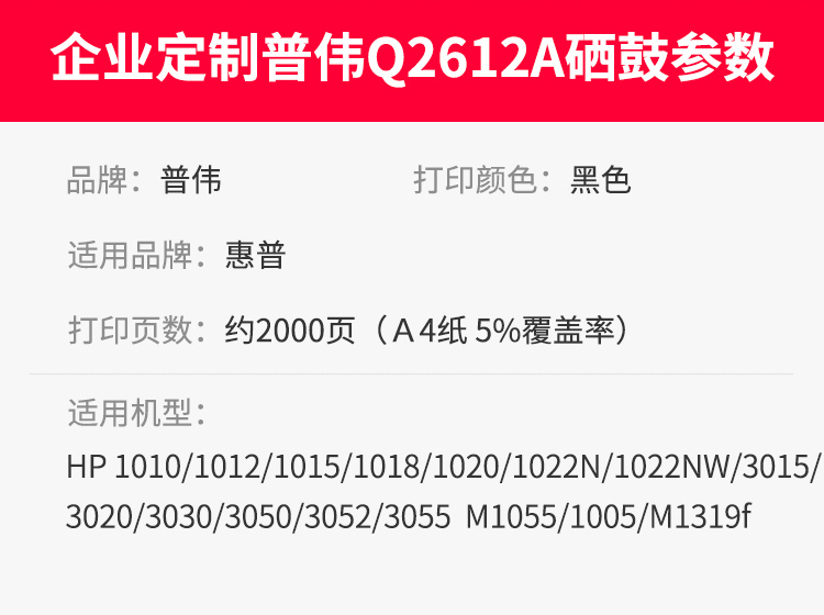 普伟 Q2612A(支)(黑色2000页)适用于1005 HP1020 plus 1010 1018 m1005m 硒鼓 1.00 只/支 (计价单位:支) 黑色