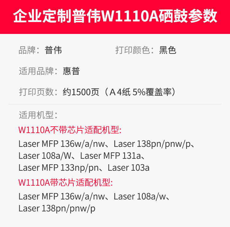 普伟 W1110A(支)(黑色1500页)适用于HP 108a 108w 136a 136w 136nw 硒鼓 1.00 只/支 (计价单位:支) 黑色