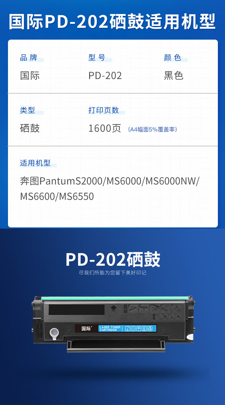 国际 PD202 打印量约1600页 易加粉适用于奔图PantumS2000/MS6000/MS6000NW/MS6600/MS6550 硒鼓 1.00 只/支 (计价单位:支) 黑色