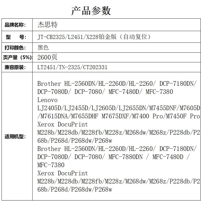 杰思特JT-CB2325/L2451/X228铂金版适用联想2451粉盒兄弟2325粉盒施乐 1支装 黑色