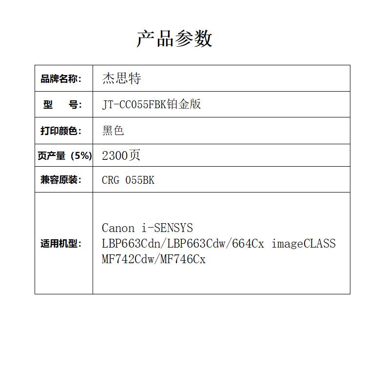 杰思特JT-CC055FBK铂金版硒鼓适用佳能LBP663Cdn 663Cdw 664Cx 单位:支 黑色