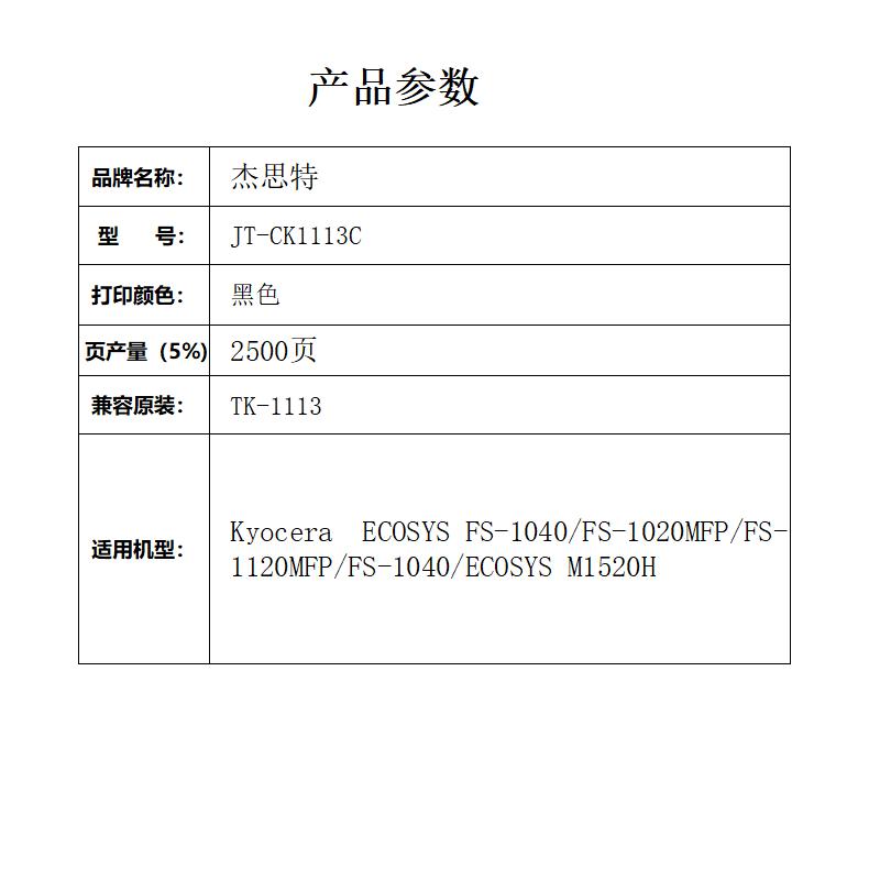 杰思特TK-1113粉盒JT-CK1113C适用京瓷FS1040 FS1020MFP 单位:支 黑色