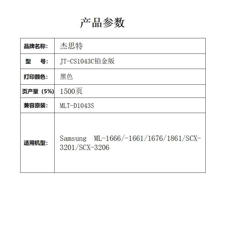 杰思特JT-CS1043C铂金版硒鼓适用三星1666 1661 1676 1861 3201支 黑色