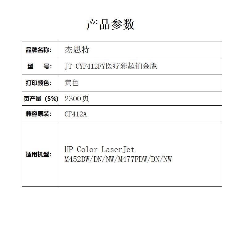 杰思特CF412A硒鼓JT-CYF412FY医用彩超铂金版 适用惠普 M477fnw 单位:支 黄色
