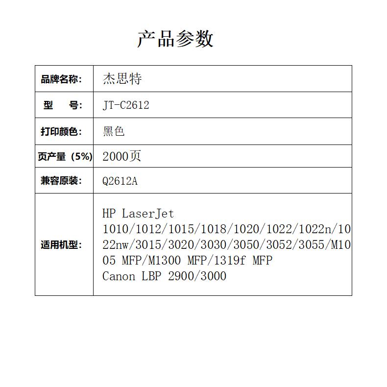 杰思特12A硒鼓JT-C2612适用q2612a 2612a墨盒惠普1005 1020plus 支 黑色