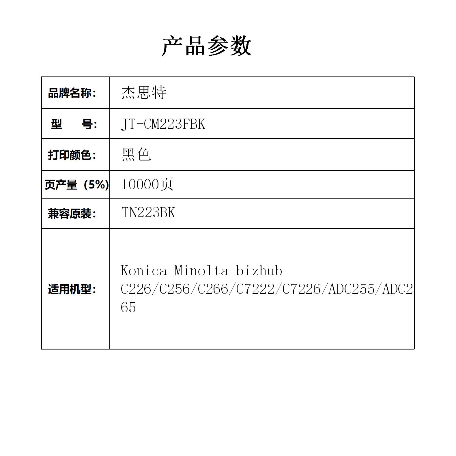 杰思特JT-CM223FBK黑色粉盒适用柯尼卡C226 C256 C266 C7222 C7226支 黑色