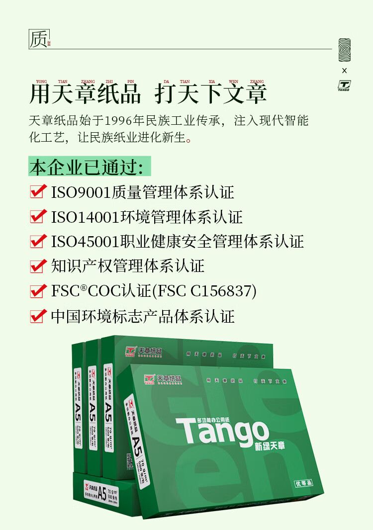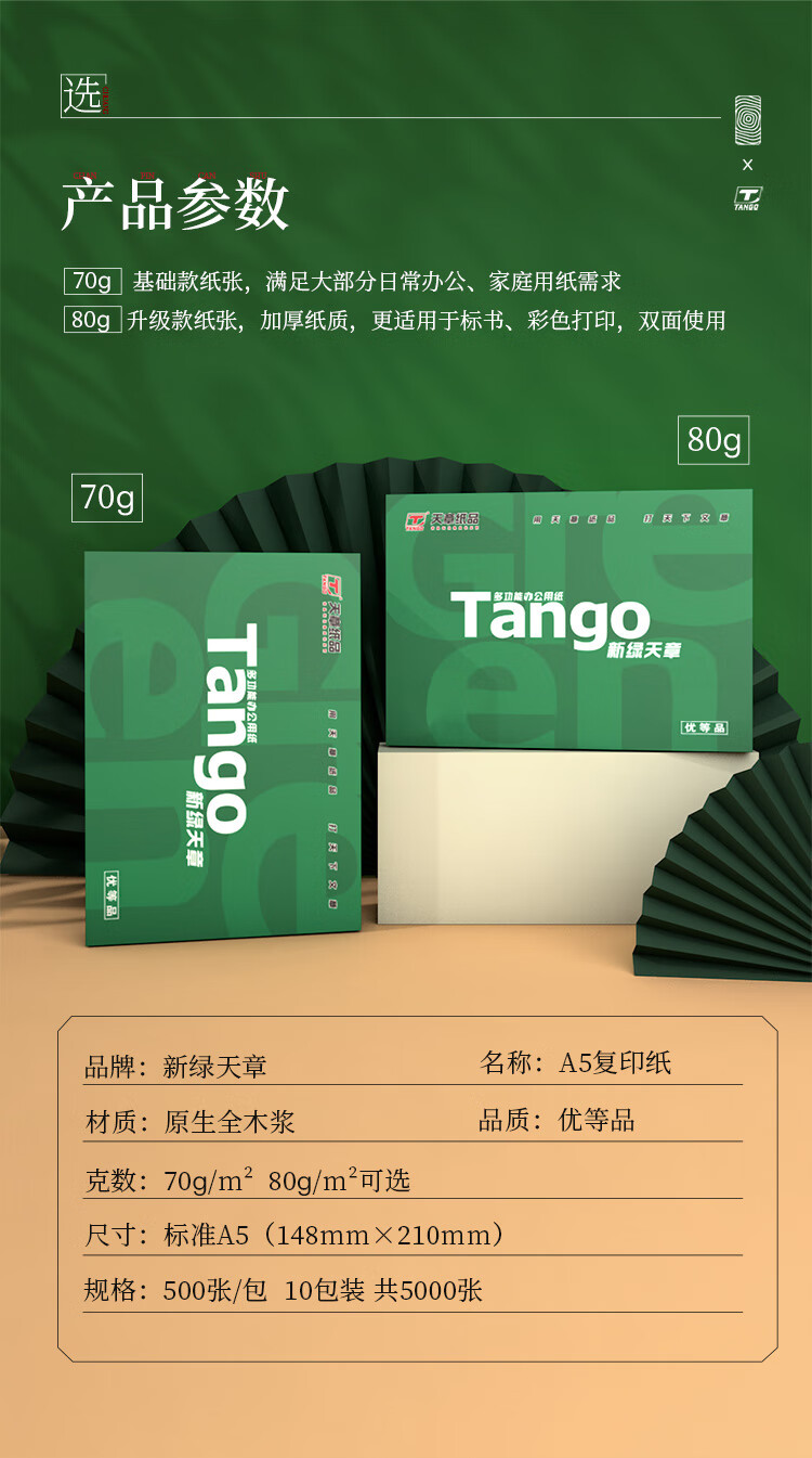 天章 (TANGO)新绿天章70gA5打印纸500张/包 5000张10包/箱 白色
