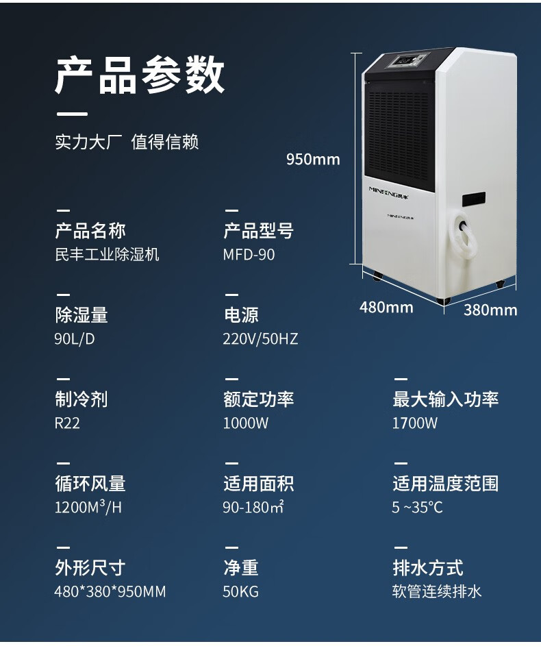 民丰MFD-90工业除湿机抽湿机适用面积90-180平方车间 仓库 地下室专用 大功率吸湿器单位:台 白色