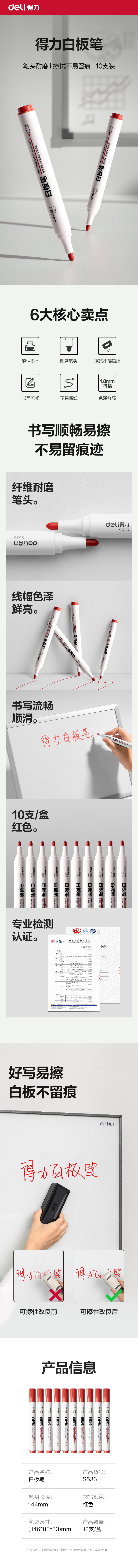 得力(deli) S536 10支 白板笔 红色(单位:盒)